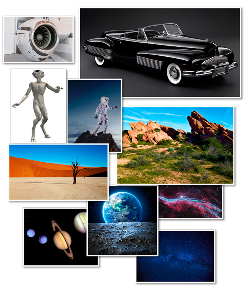 It took several stock images to create the final poster. The hovercraft is based on a vintage Buick. The passengers, landscape, and sky elements were all composed of separate images. The background terrain is Vasquez Rocks, famous as a filming location for many movies and TV shows including Star Trek. The fight between Kirk and the Gorn was filmed there, and including the rocks was another little nod to classic sci-fi.